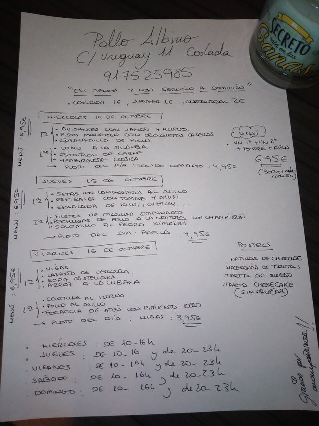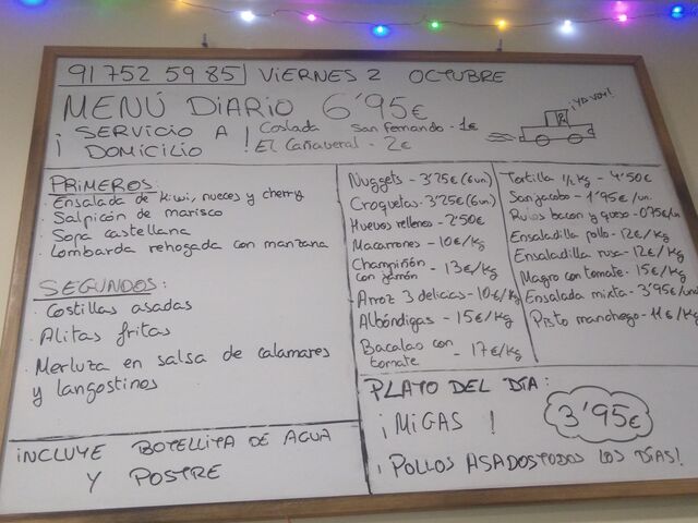 Nuestro menú de hoy, menú, pollitos, migas y maaaasss. En tienda y a domicilio ?☎️917525985 Coslada, sanfer y cañaveral